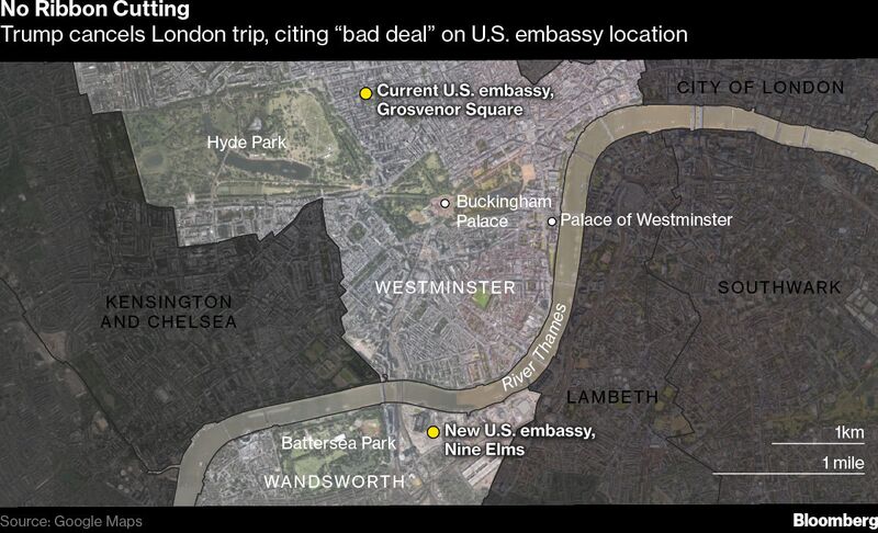 President Donald Trump’s decision to forgo a visit to London to open a new U.S. embassy kindled doubts about his justification for staying away -- even from his own nation’s diplomats.